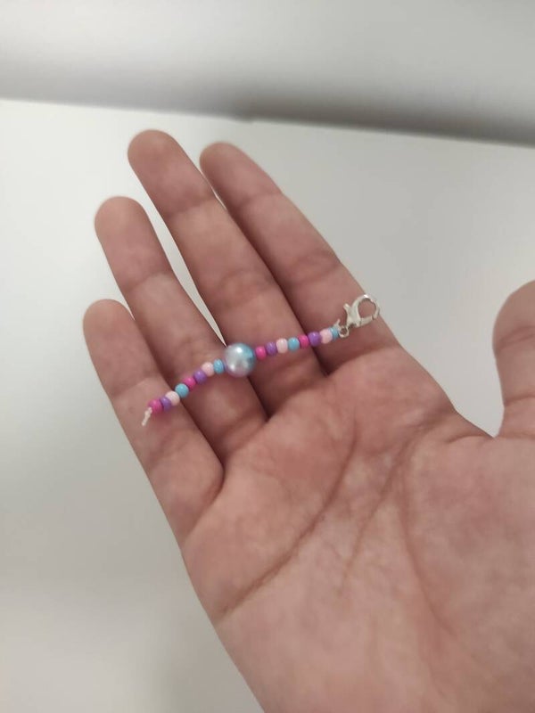 llavero de colores con una perla de color azul blanco y rosa